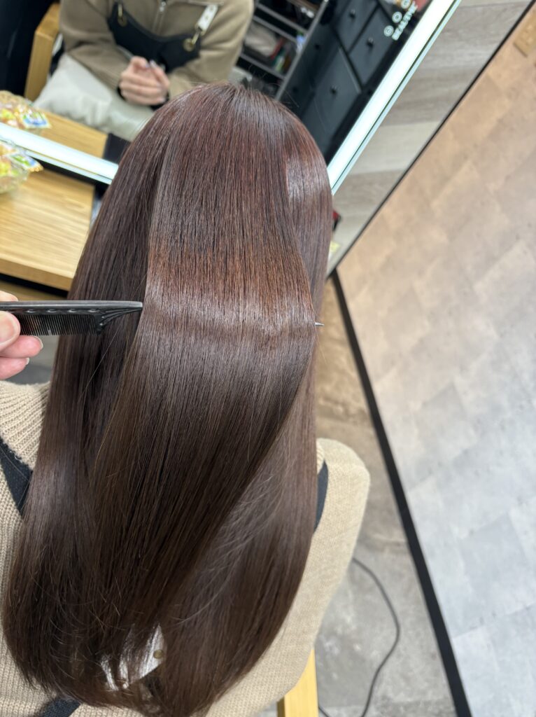 酸熱成分を入れることにより、ハリコシとツヤ、発色を格段に上げることができる施術で